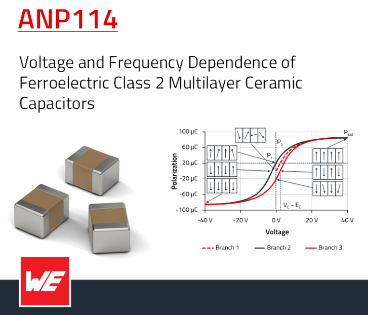 Сегнетоелектричні багатошарові керамічні конденсатори (MLCC) — це електронні компоненти, які демонструють властивість сегнетоелектриків. Вони можуть підтримувати стабільну електричну поляризацію навіть за відсутності зовнішнього електричного поля, і тому їх ємність залежить від напруги. Інструкція по застосуванню (ANP114) містить поглиблене пояснення залежності напруги та частоти сегнетоелектричних конденсаторів. Інструкція починається зі знайомства зі світом сегнетоелектрики, а потім переходить до виведення математичної моделі поведінки ємності та напруги керамічних MLCC на основі дипольної поляризаційної моделі, у якій параметри моделі зводяться до двох величин, що синхронізуються (підганяються).