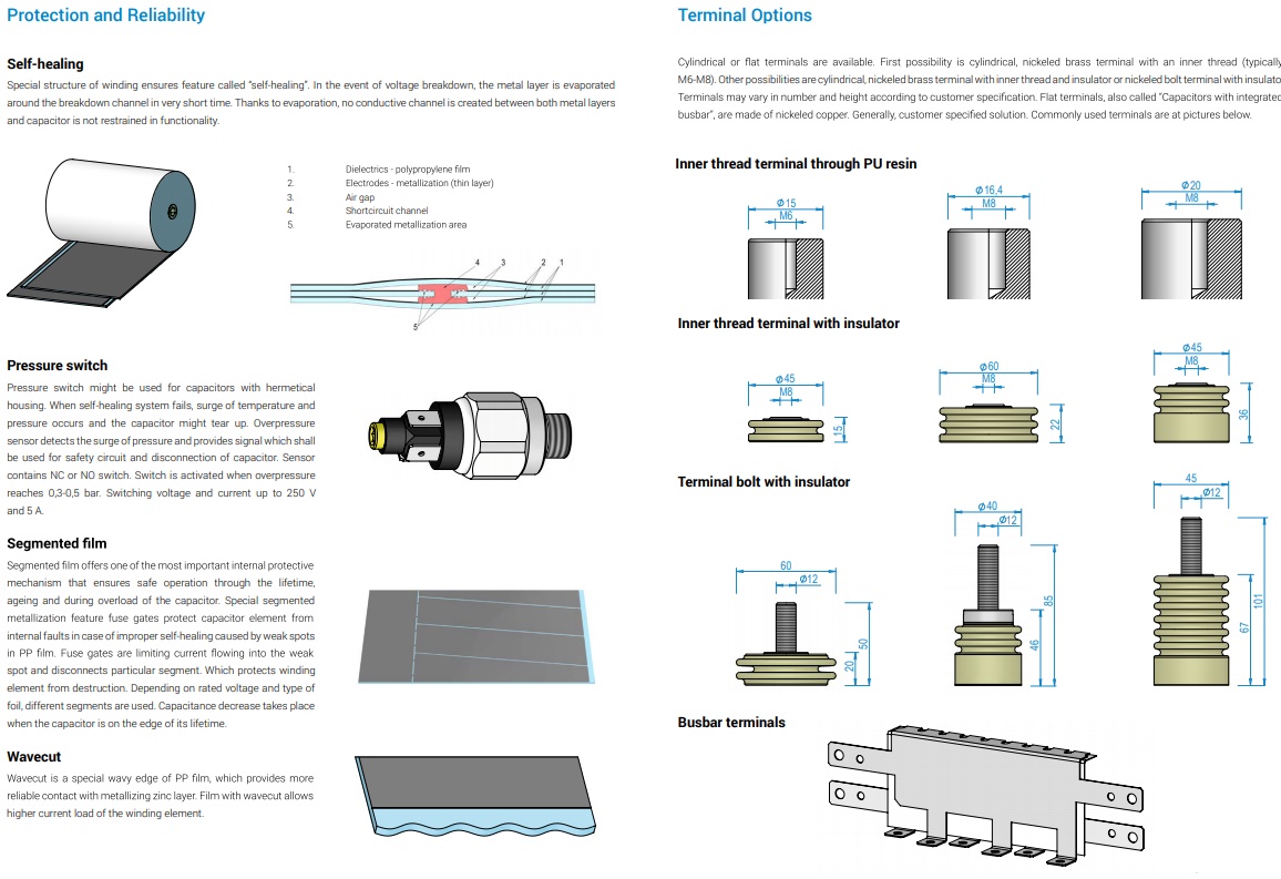 Эти конденсаторы используются в инверторах и выпрямителях. Обычно они используются в тяговом оборудовании транспортных средств (в том числе EV и HEV) или инверторах крупных промышленных приводов. Применение - входные фильтры или фильтры промежуточного контура.